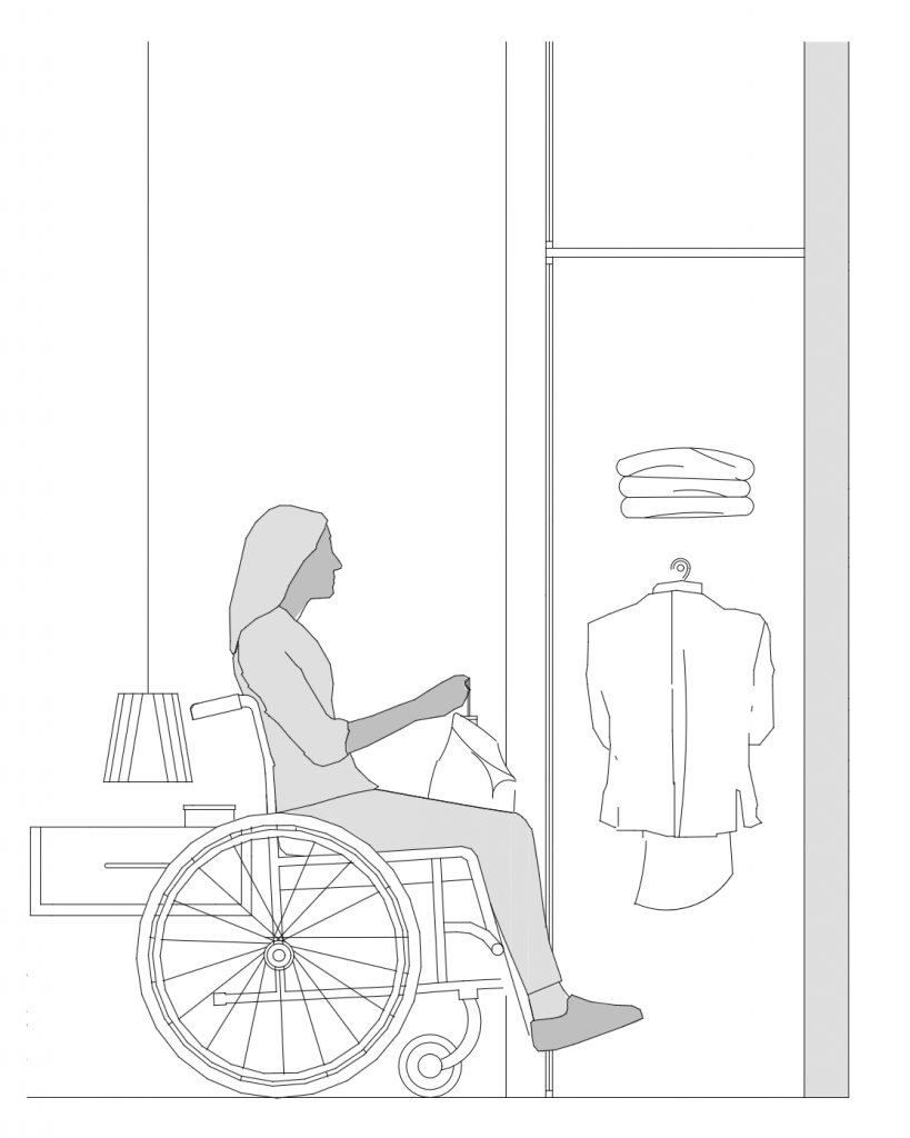 Les détails architecturaux traduisent une attention concrète aux usages quotidiens des personnes à mobilité réduite. Les portes sont décalées par rapport aux angles, facilitant l’approche avec un fauteuil roulant. Les cuvettes de WC sont avancées pour permettre un transfert latéral. Le mobilier, comme par exemple les boîtes aux lettres, est positionné à une hauteur de préhension comprise entre 80 et 120 cm. Les garde-corps sont conçus pour offrir un champ de vision confortable en position assise, permettant aux résidents de contempler le paysage depuis leur fauteuil. Les espaces de refuge intérieurs, dimensionnés pour garantir une évacuation optimale, assurent la sécurité en cas d’évacuation. Le mobilier, comme les armoires ou la cuisine, est pensé sans socles pour permettre une approche frontale.
